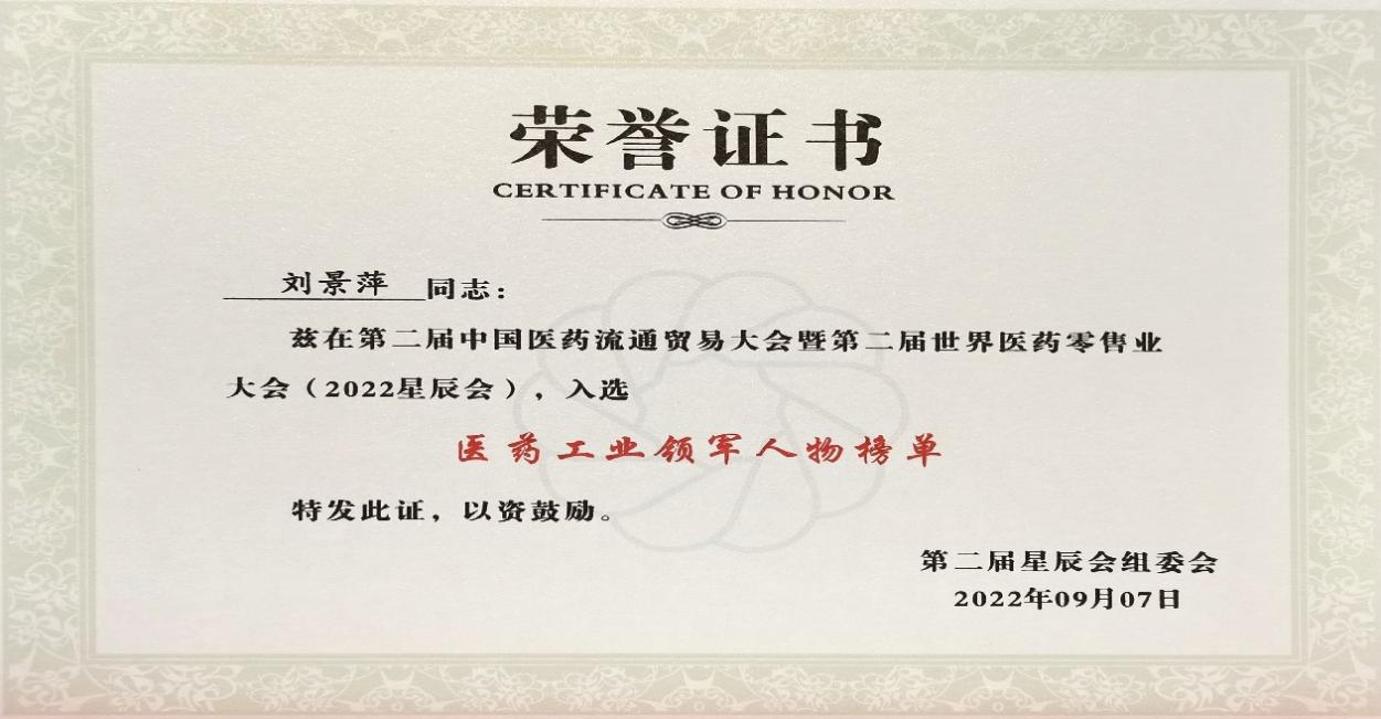 在本次开幕式上,发布了“医药工业领军人物”、“医药零售领军人物”榜单,d88尊龙z6药业集团刘景萍董事长凭借在儿药领域多年的努力探索和对行业的杰出贡献,荣获“医药工业领军人物”称号。
