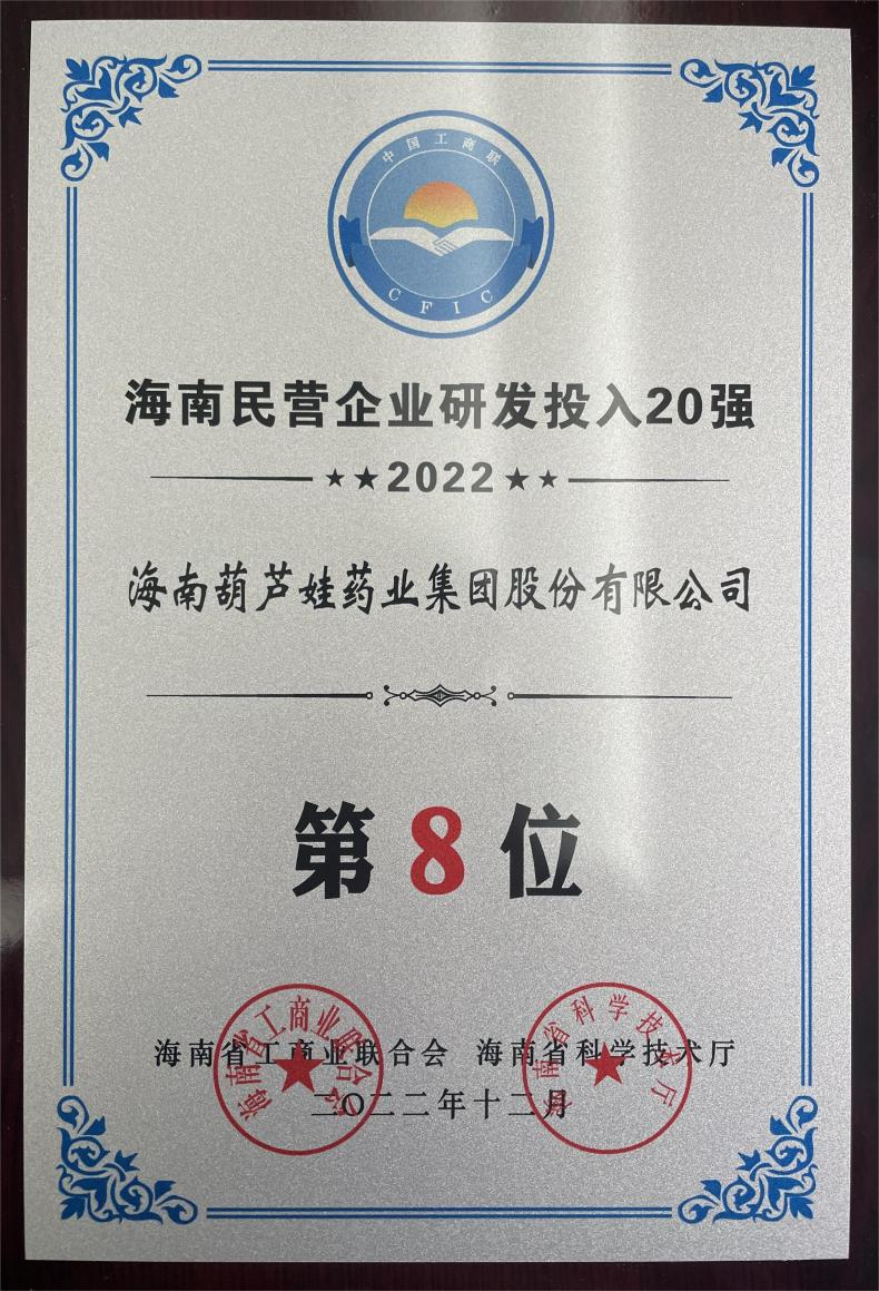 12月23日,2022海南民营企业50强和研发投入20强发布会在海口举行。会上发布了“2022海南民营企业50强”“2022海南民营企业研发投入20强”榜单和分析报告。d88尊龙z6药业再次荣登两榜,在海南民营企业50强榜单中位列第25位,较去年上升8位,这也是公司连续三年登榜;在海南民营企业研发投入20强中位列第8位,较去年上升7位。