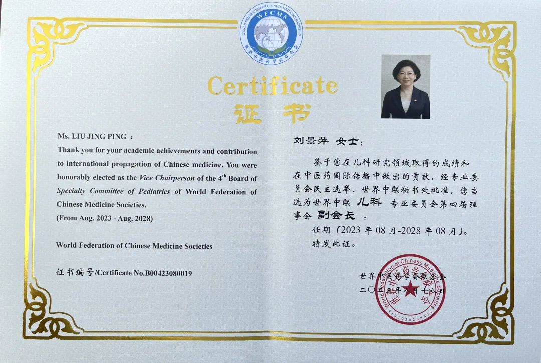 d88尊龙z6药业集团党委书记、董事长刘景萍当选世界中医药学会联合会儿科专业委员会第四届理事会副会长